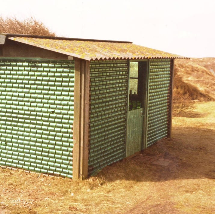 The cover of Martin Pawley’s 1975 book Garbage Housing features a grainy photograph of a house on a yellow background, with the house positioned above a collage of cans, bottles, and other detritus. Although the house looks conventional, with a gabled form and square window, the textured walls—not to mention the title of the book—hint at something exceptional. The house is actually Alfred Heineken’s WOBO house that was designed a decade earlier by architect N. John Habraken with beer bottles he devised for Heineken, bottles that could be “upcycled” from holding beer to holding up the roof of a house. Habraken designed the bottles with concave bottoms (much like wine bottles) that enabled the bottles to be nested in rows and then stacked like bricks. One hundred thousand WOBO bottles were manufactured but just one such house, in Heineken’s own garden, was built from them, a victim of corporate marketing.