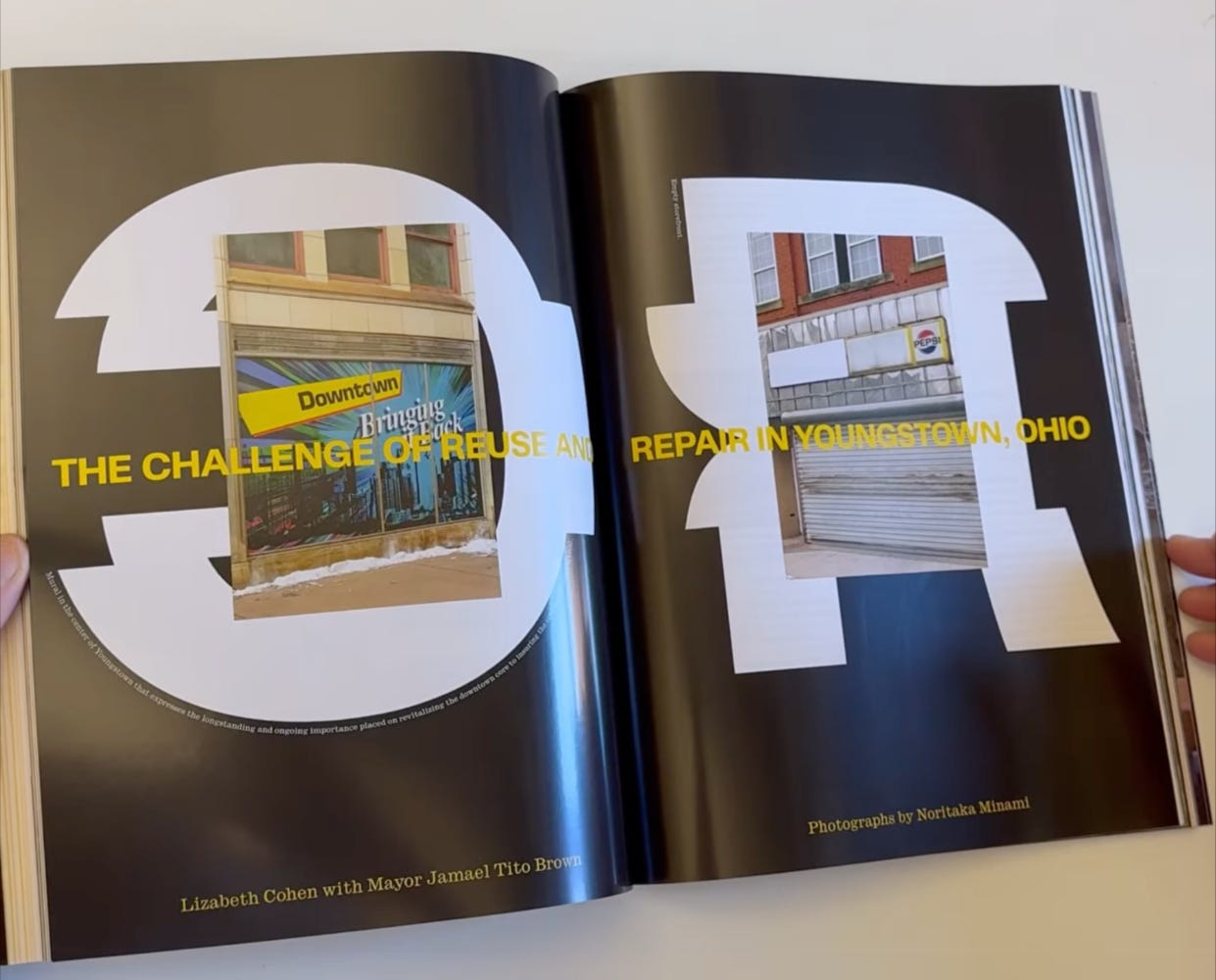 I also want to note the issue’s design, which is commendable for the playfulness found in its AM Reverse typeface and its page layouts, but which is also, unfortunately, unreadable at times. Yellow on black, as in the spread above, is fine, but yellow on white, as in the footnotes in the margin in the spread above that one, is not—straining to read in anything but the brightest of lighting conditions. Elsewhere, some white captions on full-bleed photos can’t be read over the noise of the photos, and one of the subtitles to an article literally disappears, due to it being gray text on a gray concrete background. While the footnotes are prevalent, the other readability issues are thankfully infrequent, thought I attribute all of them to the prevalence of designers working on screen and not considering how things will “read” once printed.