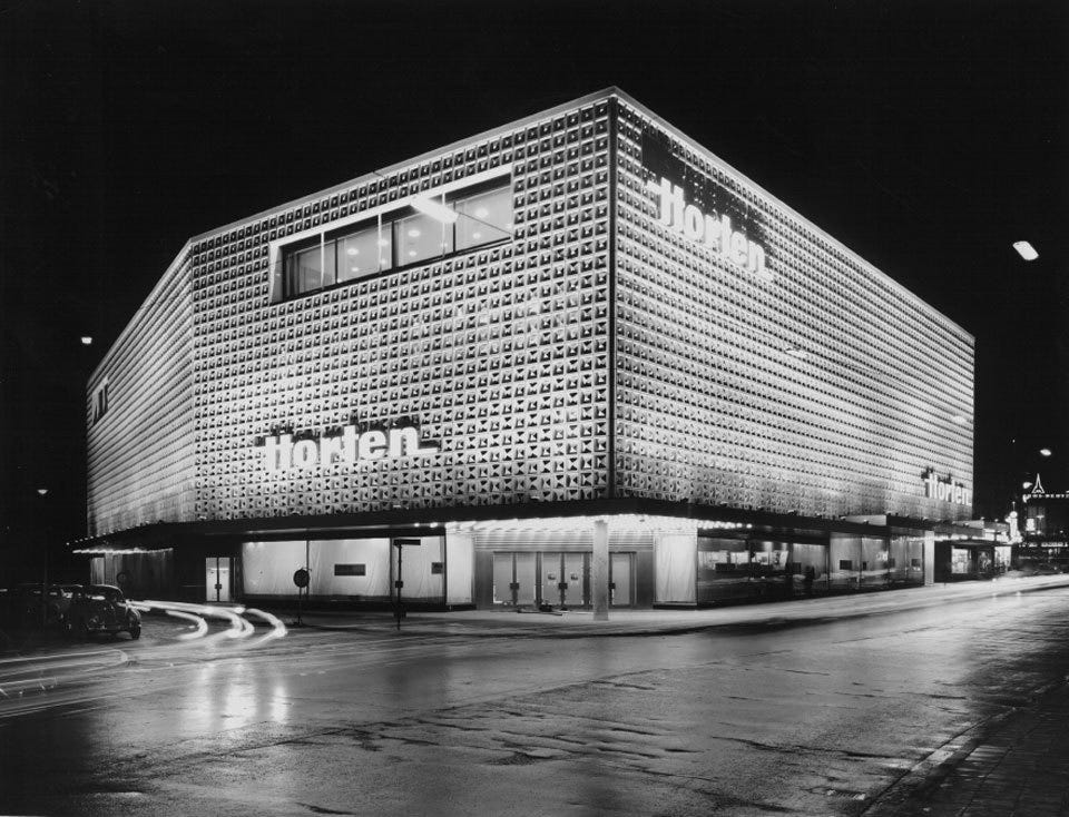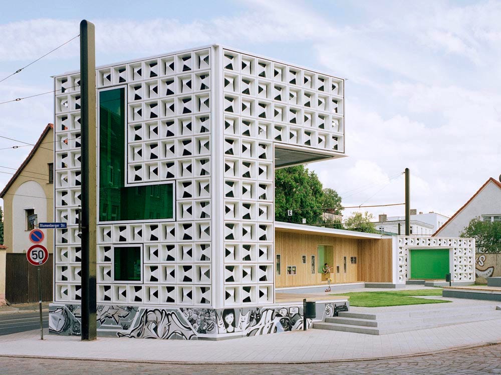 In 1966, just a couple years after Heineken’s WOBO house, the Horten department store, designed by Rhode Kellermann Wawrowsky (RKW), was built in Hamm, Germany. The outer layer of the store was covered in molded aluminum tiles that gave the building its modern, textured appearance. Fast forward to 2007 and the unfortunate demolition of the 41-year-old department store: fortunately, many of the Horten tiles were saved and sold for reuse. KARO* architekten worked on one project (the only one I’m aware of) that reused the tiles: the award-winning Open-Air Library located in “a socially depressed” area of Magdeburg, Germany. Previously the library on the same site was temporary, made from milk crates. With the Horten tiles, the Open-Air Library became permanent, another example of “upcycling” a material, or in this case a component.