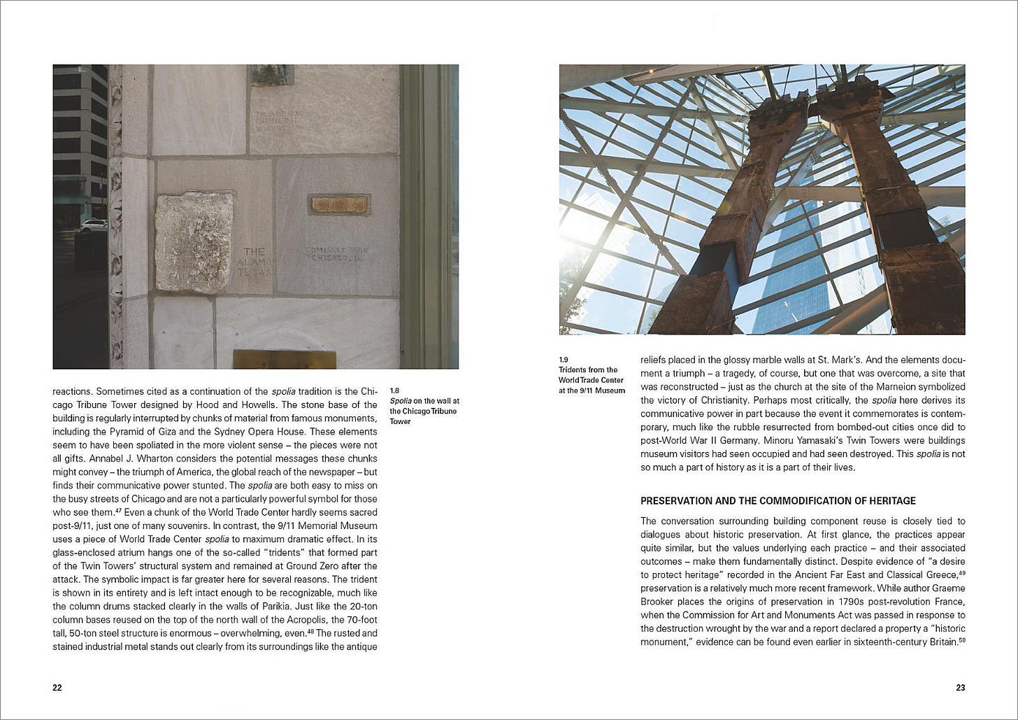 Inside the book are a dozen contributions in two sections: “History of Reuse and Repurposing” and “Reuse and Repurposing of History?” They follow editor Daniel Stockhammer’s excellent introduction, which highlights the increasing attention given to adaptive reuse and other ways of preserving materials over the long-held focus on new buildings valued for formal innovation. It’s a refreshing shift toward an approach that has been done for centuries, as the examples in the book show, but is being discussed more and more as climate change and resource scarcity increases. More than having a firm grounding in issues of sustainability, adaptive reuse and examples of upcycling should be seen as impetuses for creativity: the layering and collision of old and new should be enthusiastically embraced by architects, not just forward-thinking clients like Alfred Heineken. This book offers a myriad of examples, from both academics and students, that should intellectually inspire architects interested in an upcycling design approach.