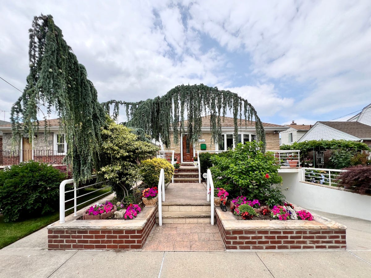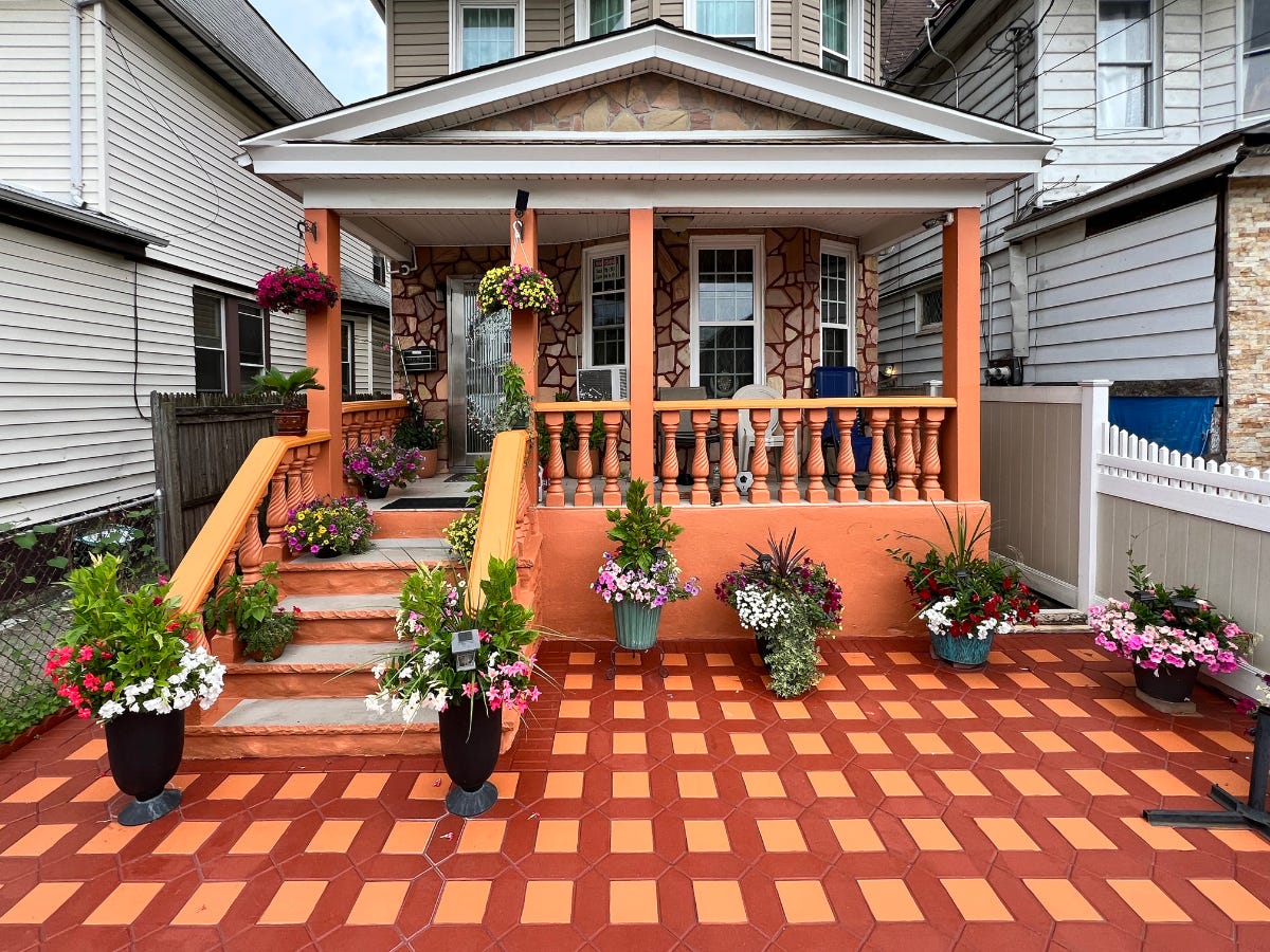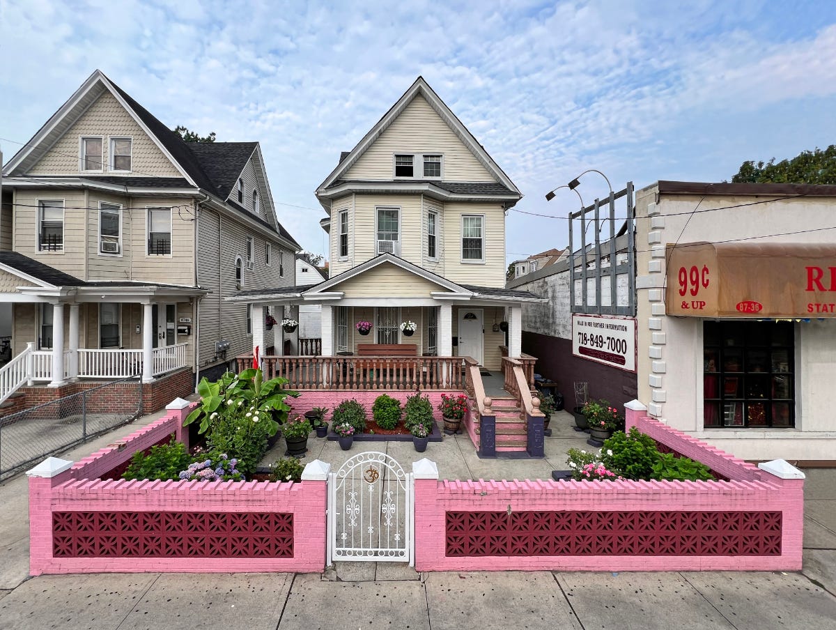 Thoughts of trash occupied part of my mind when I cracked open Rafael Herrin-Ferri’s All the Queens Gardens: Everyday Landscaping in New York’s Largest and Most Diverse Borough, a followup to his 2021 book All the Queens Houses: An Architectural Portrait of New York’s Largest and Most Diverse Borough. Although Queens, unlike Manhattan, does actually have some areas with alleys, they are typically lined with garages rather than dumpsters, so trash is still mainly picked up at the sidewalks in front of buildings. And given that the gardens in Herrin-Ferri’s book are “for the most part street-facing,” I wondered how much the “everyday landscaping” would be impacted by the needs of twice-weekly trash collection. Outside of a few instances, such as the aptly titled “Trash-and-Recycling Tableau” in Woodside, just east of Astoria, I needn’t have worried: the book is full of a diversity of curious and creative gardens that echo the diversity of the “world’s borough.”