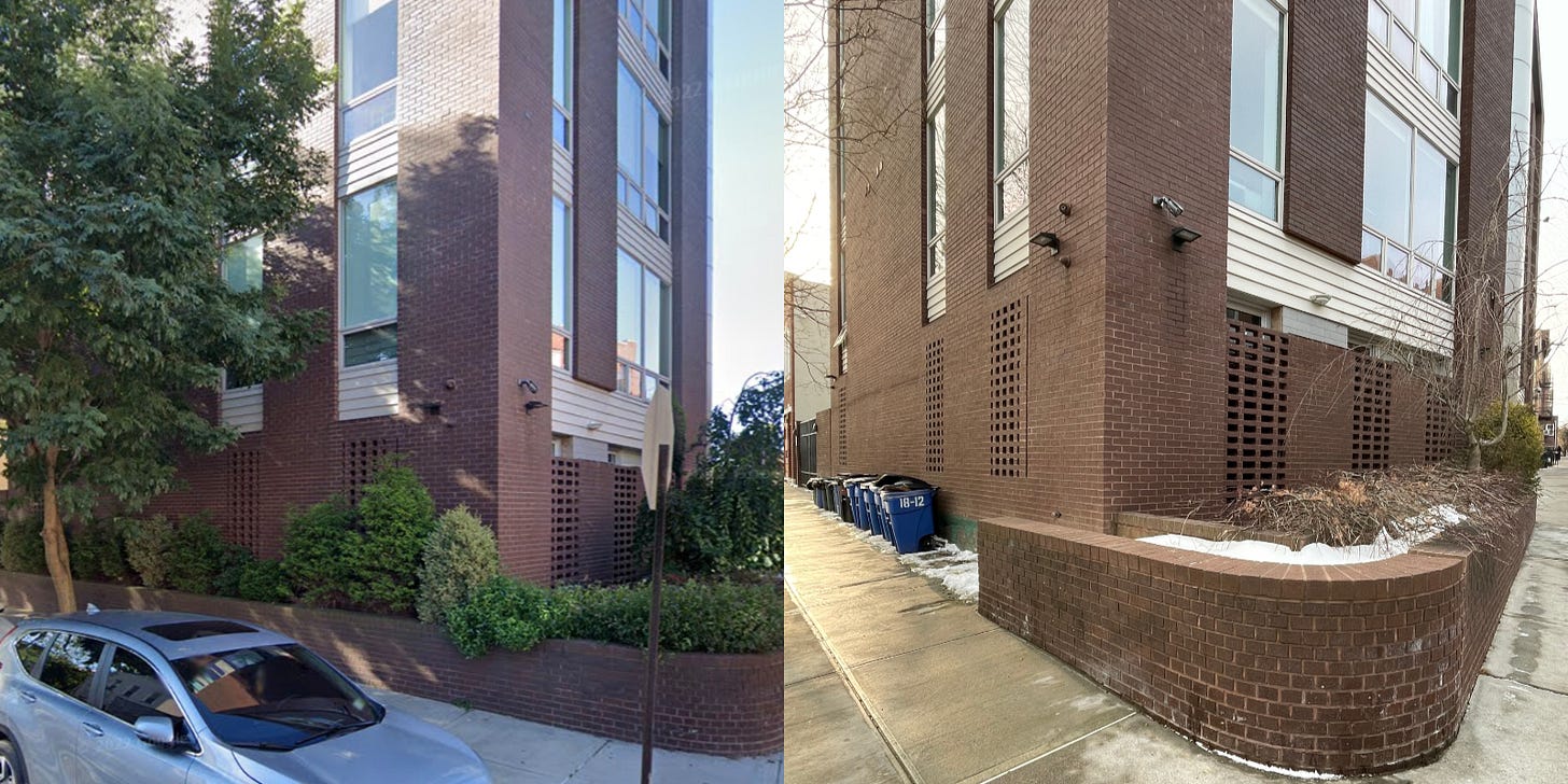 With roughly 8-1/2 million people spread across—or I should say packed into—New York City’s five boroughs, the amount of square feet afforded each NYC resident is around 500 square feet. This is one way of describing how even the smallest of spaces in the city are important, that eventually every bit of leftover or unused space will be occupied or find a use. And with so much area given over to roads, sidewalks, and buildings, many parks and gardens find themselves squeezed into the smallest of spaces, be it pocket parks like Septuagesimo Uno on West 71st Street or a planting bed wrapping the corner of an apartment building in my neighborhood of Astoria, Queens. The latter, seen below, was recently truncated to accommodate garbage bins following the city’s new Residential Waste Containerization rules, which have helped reduce the number of rats in the city but are now forcing a choice on some landlords and residents: garbage or green?